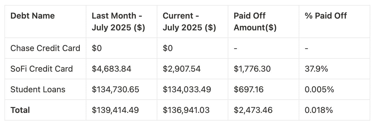 Here’s where I stand on my journey to zero debt as of August 1, 2025. Below is a side-by-side comparison with last month, showing exactly how much progress I made.