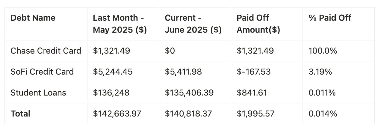 Here’s where I stand on my journey to zero debt as of June 1, 2025. Below is a side-by-side comparison with last month, showing exactly how much progress I made.